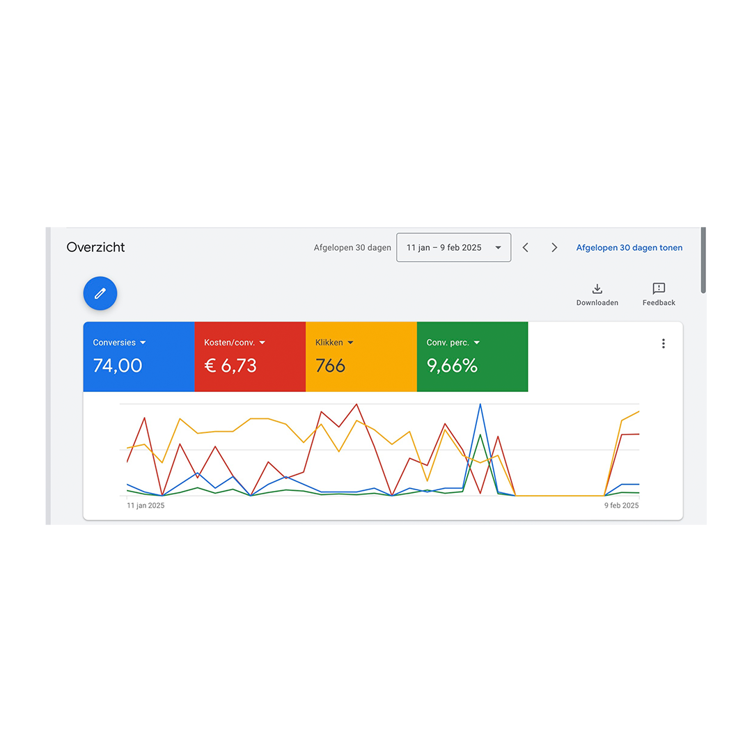 Google Ads campagne afgelopen 30 dagen gedraaid door Marketing Nexus voor een softwarebedrijf. Zeer goede kosten per conversie met een mooie conversiepercentage. Strategie van het zoeken van de juiste keywords en doelgroep in combinatie met de perfecte websiteoptimalisatie heeft gezorgd voor deze geweldige conversie.