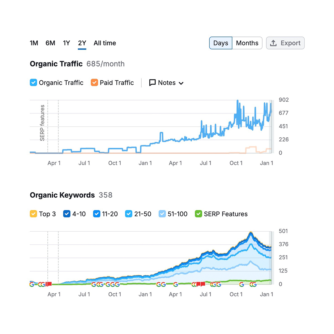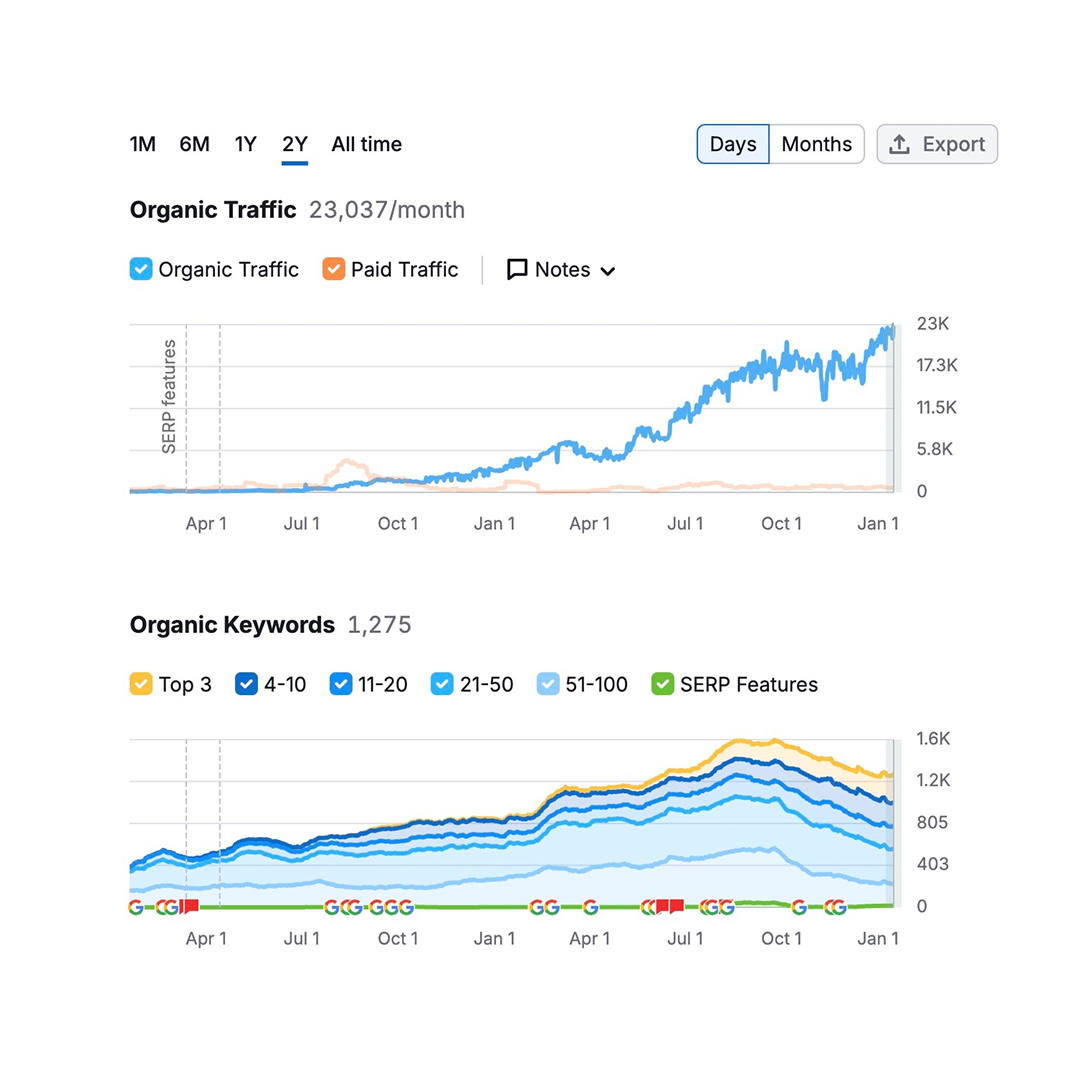 Een zeer mooie groei in organisch verkeer sinds ons SEO-team begonnen is. Van enkele honderden website bezoekers per maand naar ruim 20k per maand. Door onze backlink strategie in combinatie met alle SEO vriendelijke content die geïmplementeerd is, zien we een gigantische groei in keywords en verkeer.
